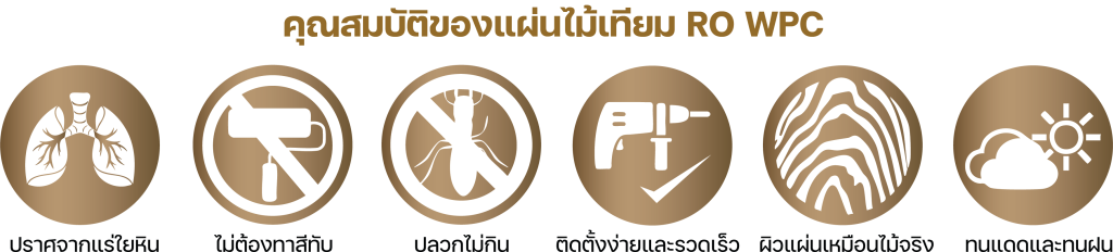 RO WPC คือ “ไม้เทียม” หรือ “ไม้สังเคราะห์” แบบสำเร็จรูปชนิดพิเศษ ที่เกิดจากการผลิตด้วยนวัตกรรมรักษ์ธรรมชาติทดแทนการใช้ไม้จริง ที่อาจเกิดปัญหาเรื่องปลวกกิน การเกิดเชื้อรา การลามไฟ และการบวมน้ำของแผ่นไม้ ดังนั้น “ไม้เทียม RO WPC” จึงเป็นวัสดุยอดนิยมทางเลือกใหม่ ที่ดูแลรักษาง่าย แต่ทนแดด ทนฝน ไม่บวมน้ำ ไม่ผุ ไม่เป็นเชื้อรา เมื่อติดตั้งแล้วไม่ต้องทาสีหรือเคลือบน้ำยาซ้ำ มีอายุการใช้งานยาวนาน ด้วยดีไซน์ของเฉดสีและผิวสัมพัสที่ให้ความรู้สึก ผ่อนคลาย อบอุ่น อ่อนไหวนุ่มนวล เป็นธรรมชาติมีทั้งความคลาสสิคและมีความทันสมัยอยู่ในตัว จึงสามารถนำไปใช้ในงานติดตั้งได้หลากหลายสไตล์ เหมาะสำหรับงานตกแต่งสถานที่ งานต่อเติมอาคารพื้นที่ใช้สอย งานออกแบบโครงสร้าง บริเวณพื้นที่ที่ต้องการติดตั้งได้ทั้งภายในและภายนอก